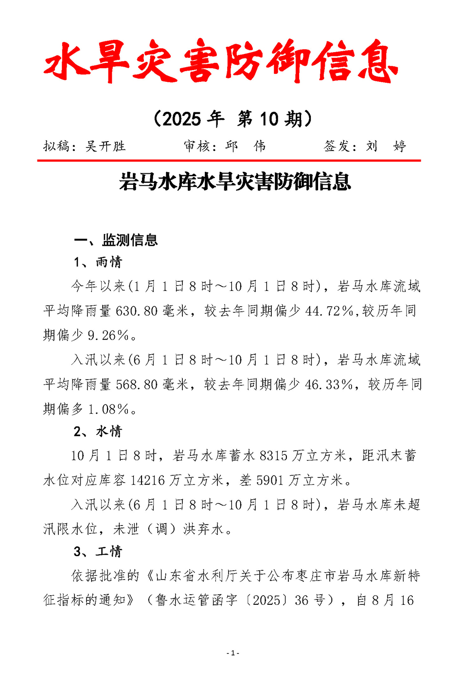 > 岩马水库水旱灾害防御信息(2025年第10期)